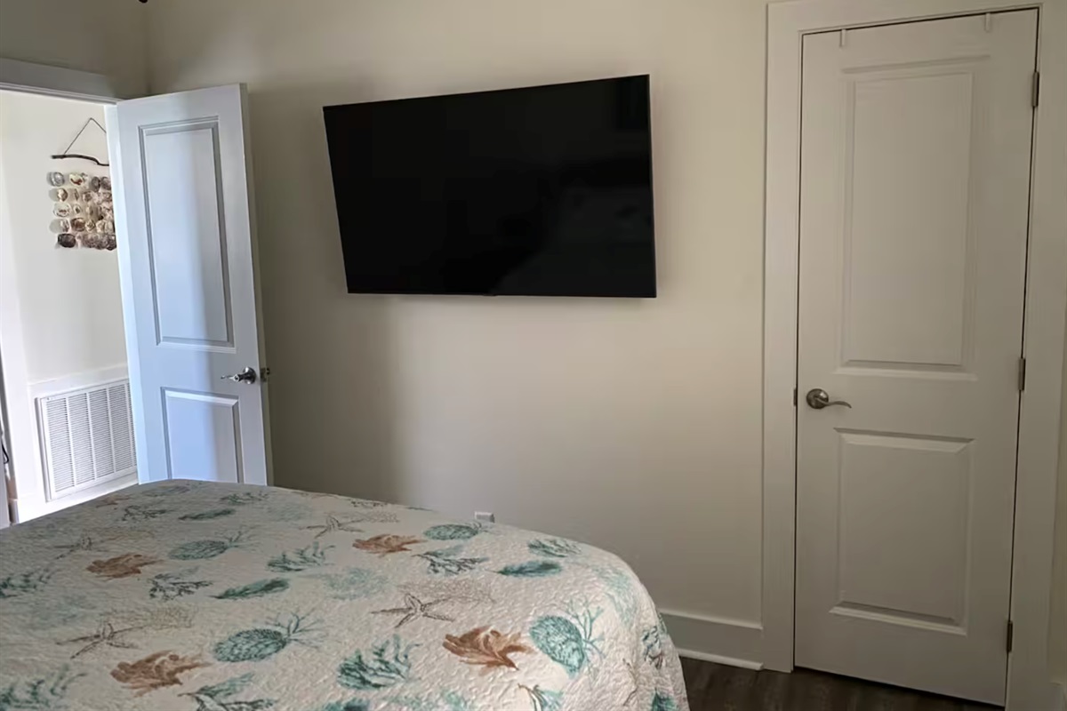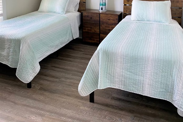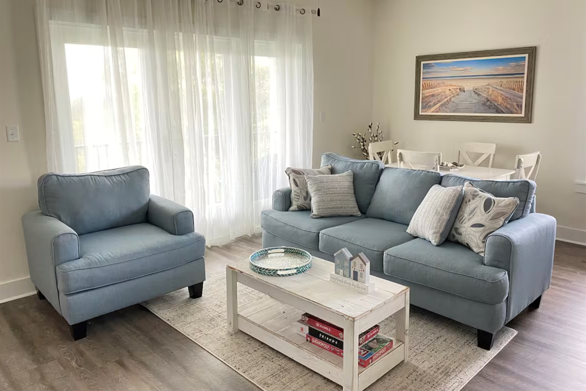 Sleeping accommodations include a king bed in the primary bedroom, a queen bed in the guest bedroom, two twin beds in the second guest bedroom, and a sofa sleeper in the living room, comfortably hosting your group. Step out onto the private patio to enjoy your morning coffee or unwind in the evening with a glass of wine.