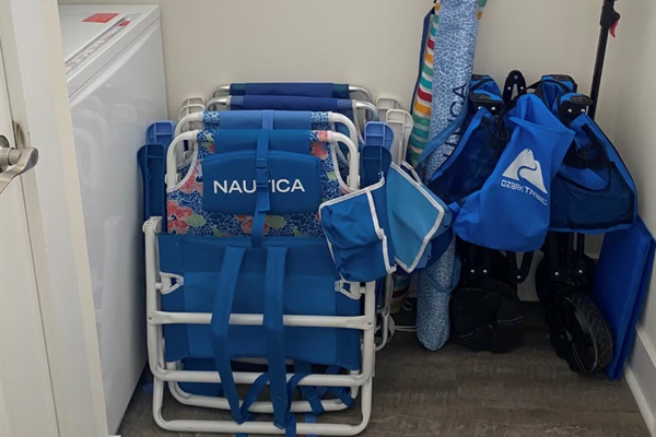 To make your beach days effortless, the condo is stocked with beach essentials, including four beach towels, four beach chairs, an umbrella, and a beach wagon.