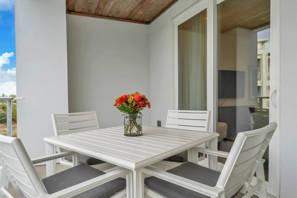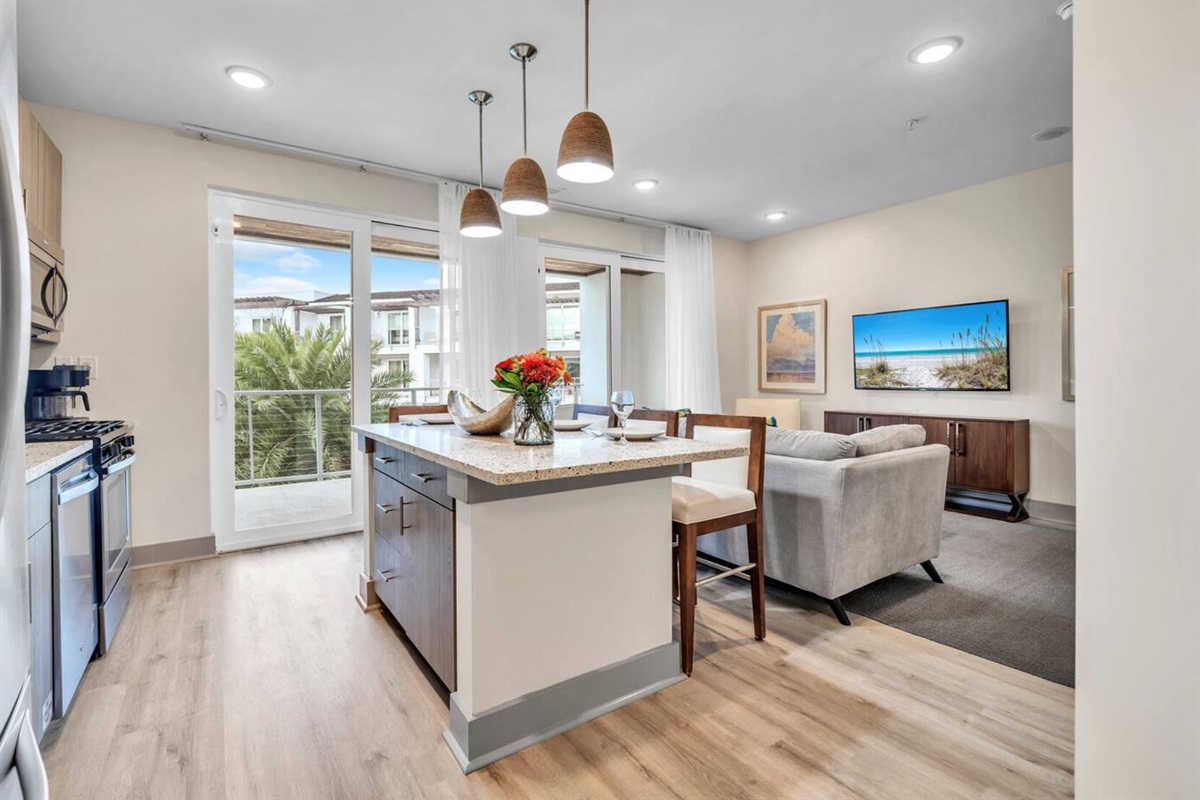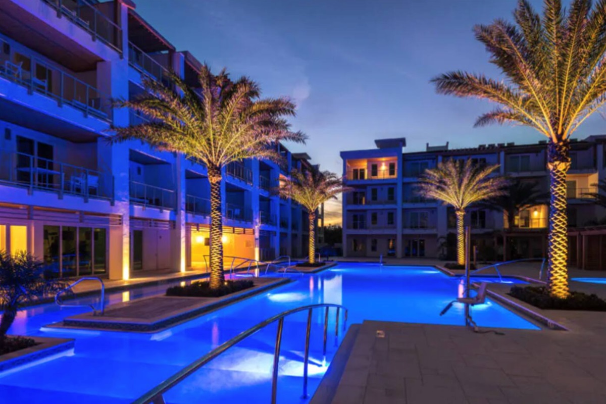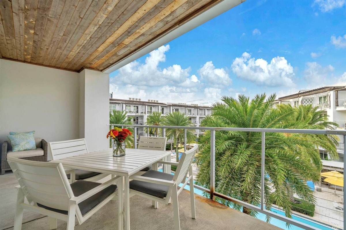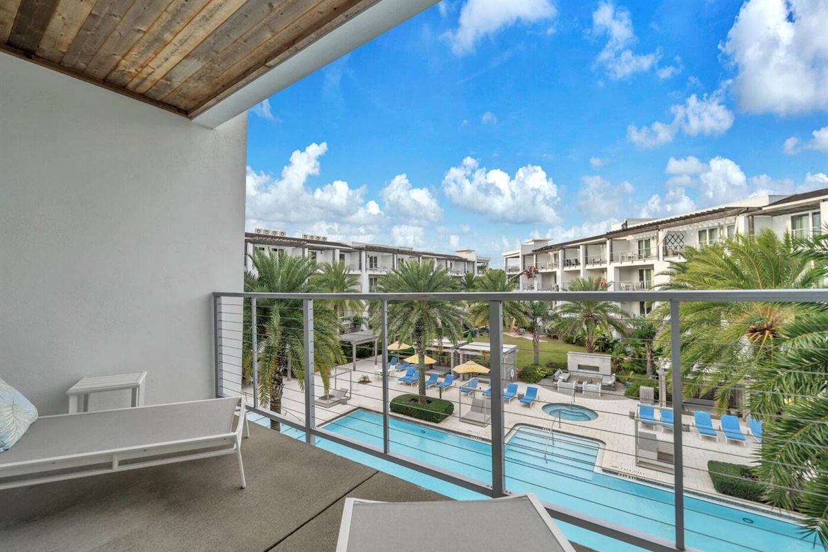 Two private balconies (one off the kitchen, one off the primary bedroom) overlooking the grounds and resort pool