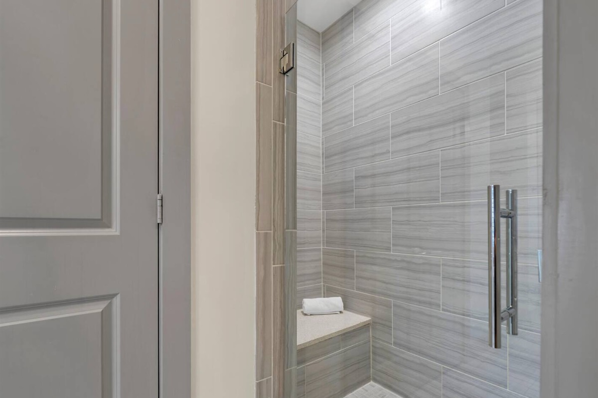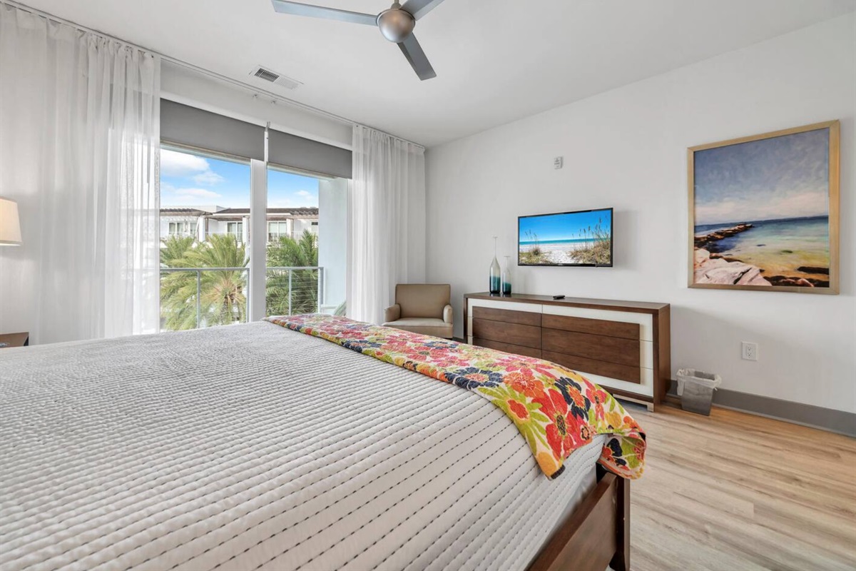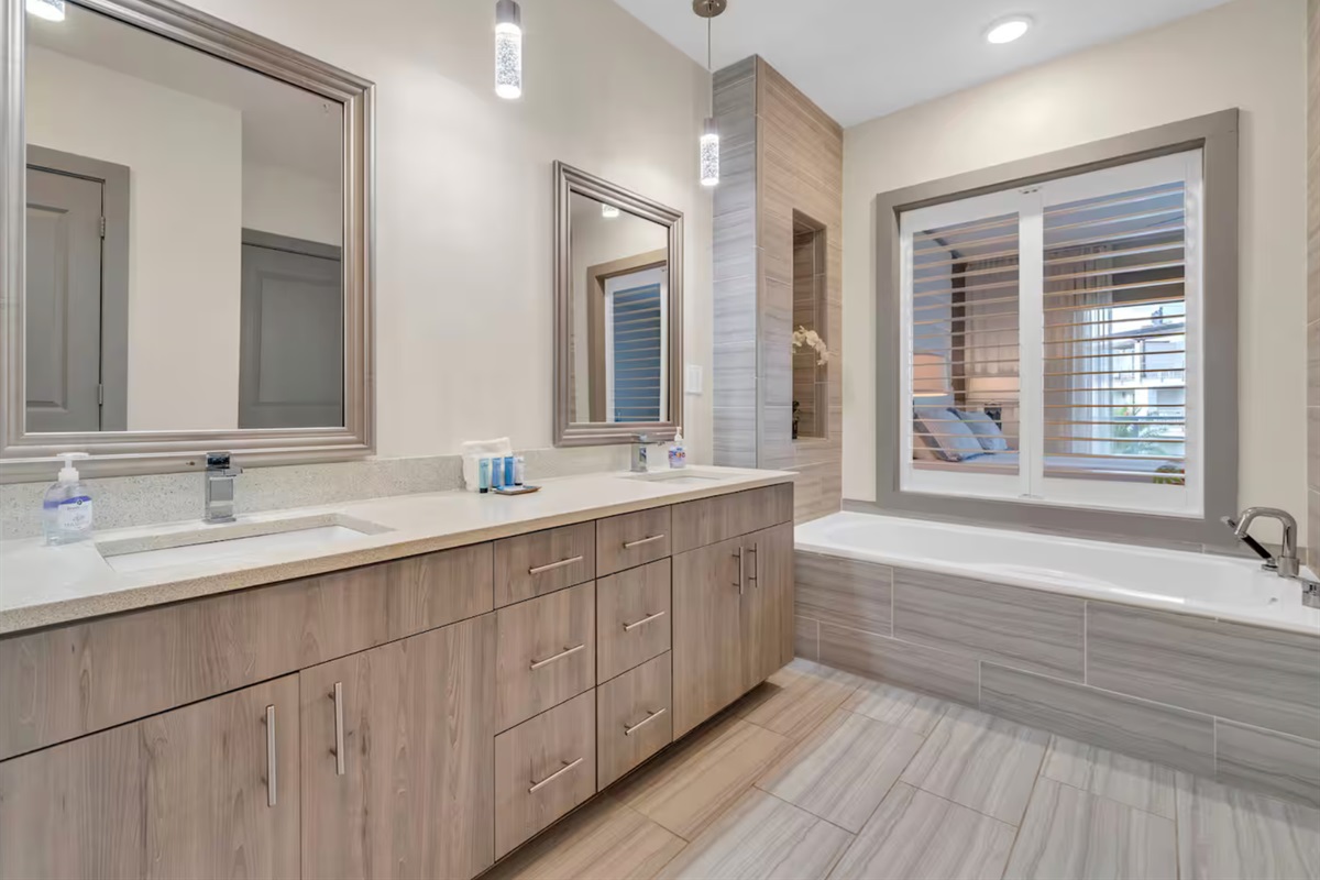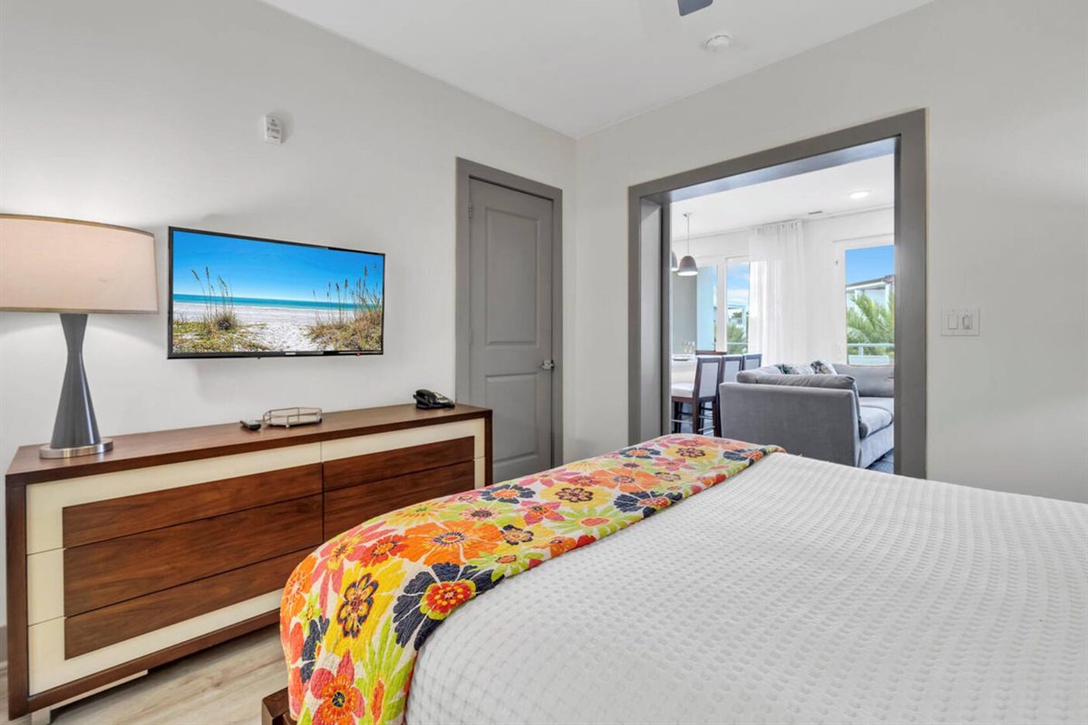Primary Bedroom: King bed, TV, dedicated workspace, and ensuite bathroom with garden tub and walk-in shower