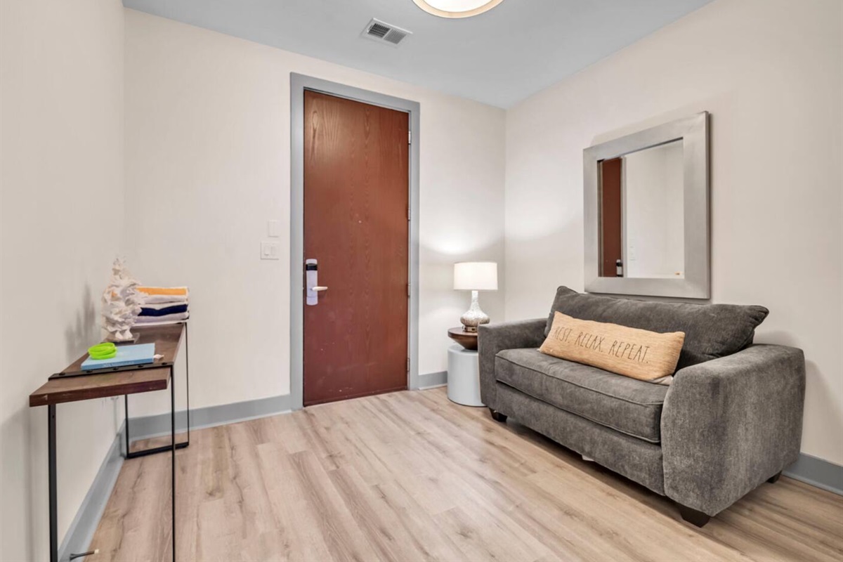 Open-concept living area with sleeper sofa