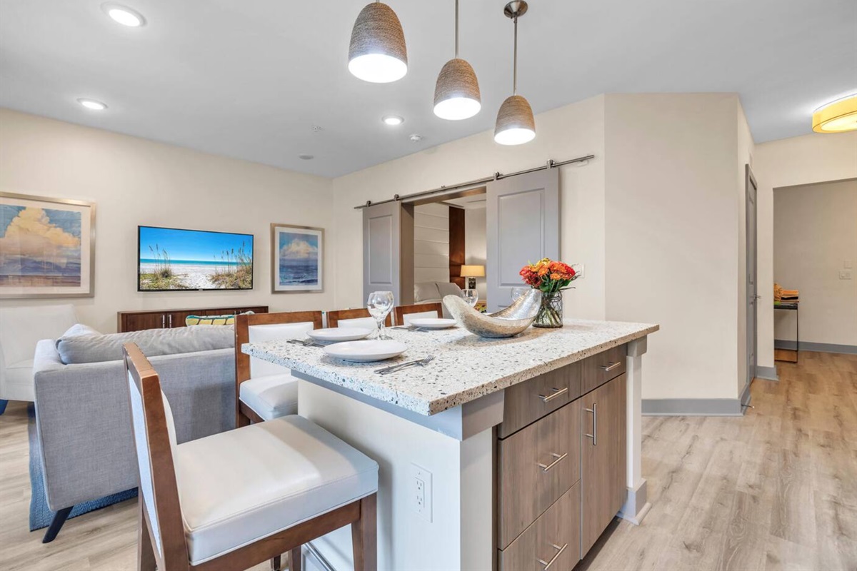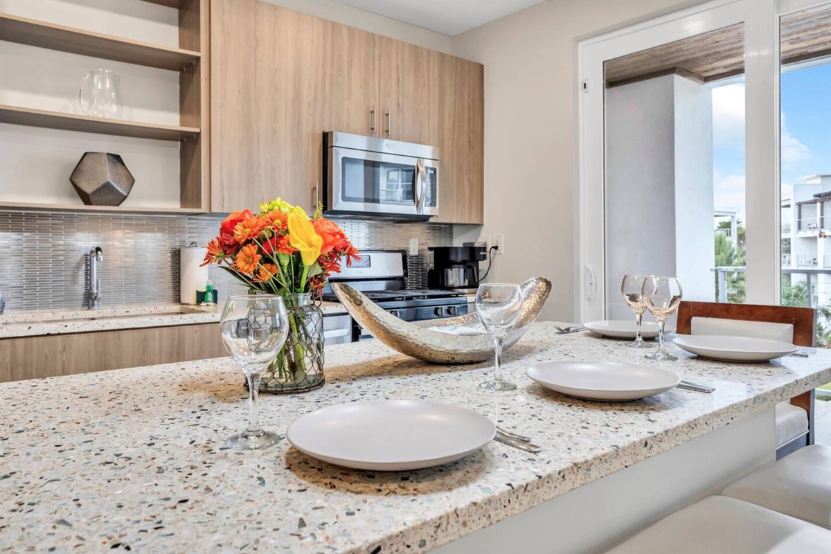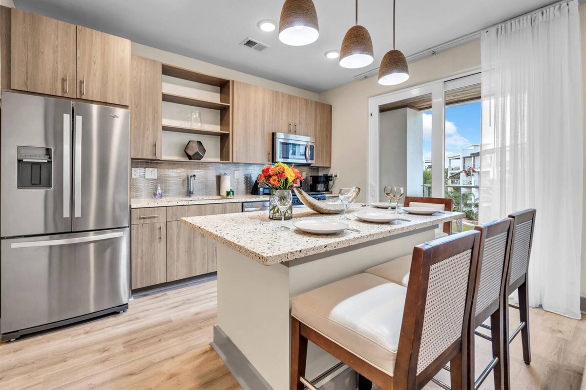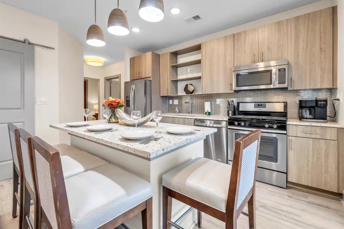 Fully stocked kitchen with bar seating and all essential cookware