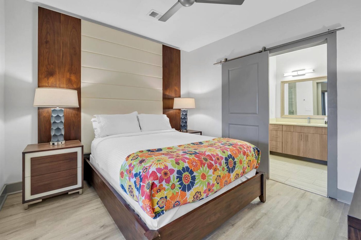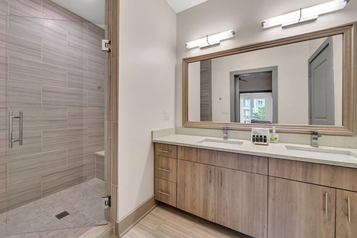 Second Bedroom: Queen bed, TV, board games, and ensuite bathroom with dual vanities and walk-in shower